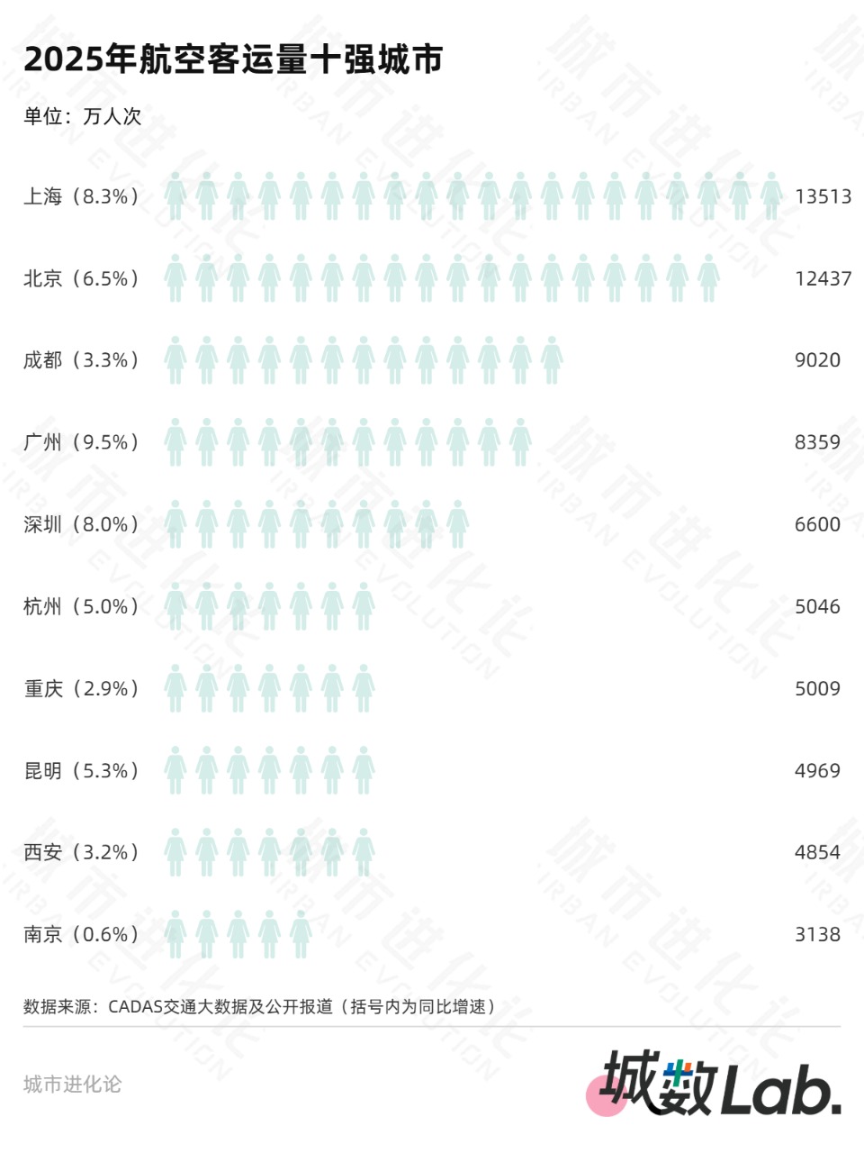至此,内地机场“5000万俱乐部”成员增至9座,位列第十的昆明长水机场也以4969万人次无限逼近这一门槛。如果从城市的角度来看,2025年航空客运量TOP10分别是上海、北京、成都、广州、深圳、杭州、重庆、昆明、西安、南京。