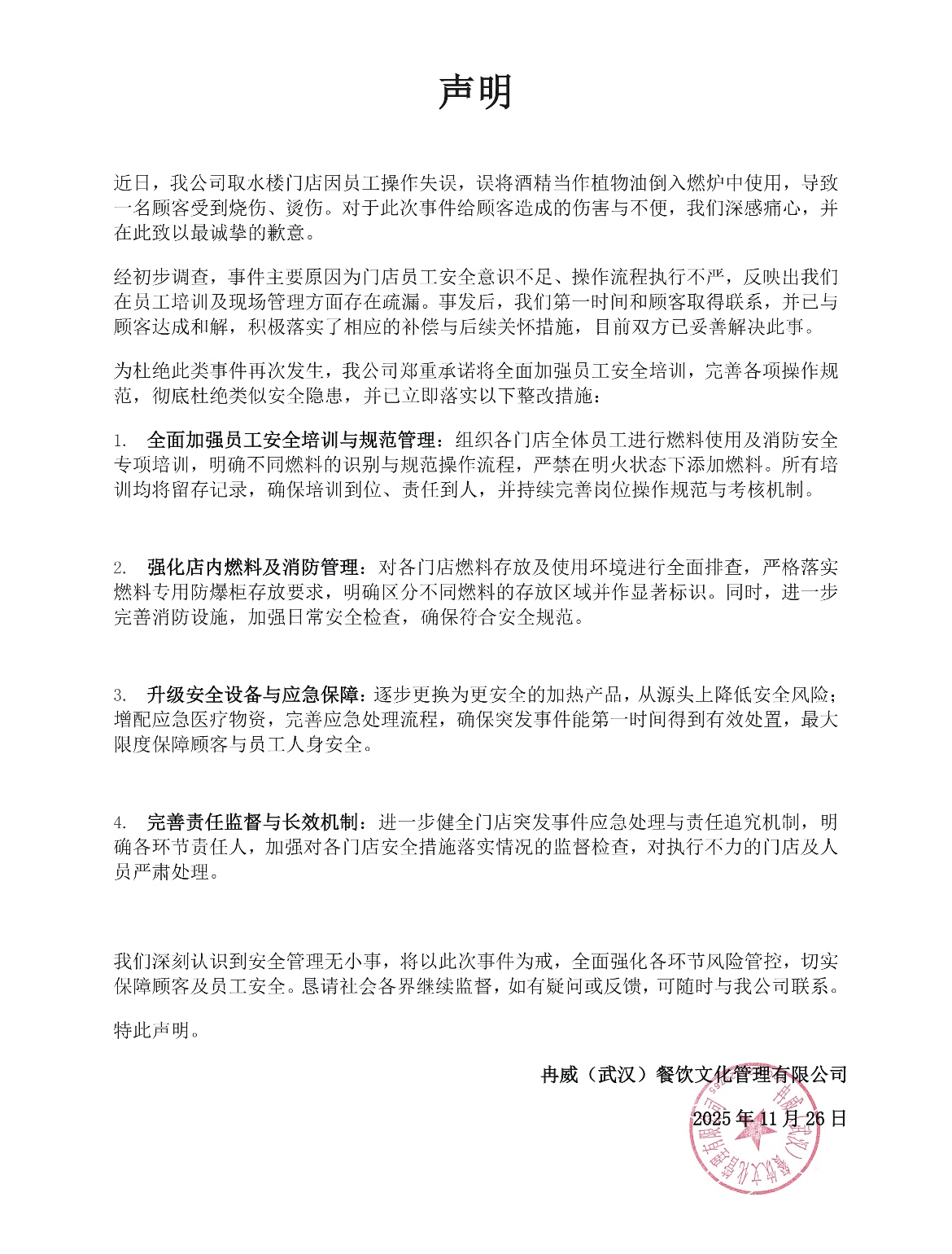 26日下午,记者看到阳圣坊老北京涮肉官方账号就此事发布声明。声明提到,阳圣坊老北京涮肉(取水楼门店)因员工操作失误,误将酒精当作植物油倒入燃炉中使用,导致一名顾客受到烧伤、烫伤,对于此次事件给顾客造成的伤害与不便,表示歉意。